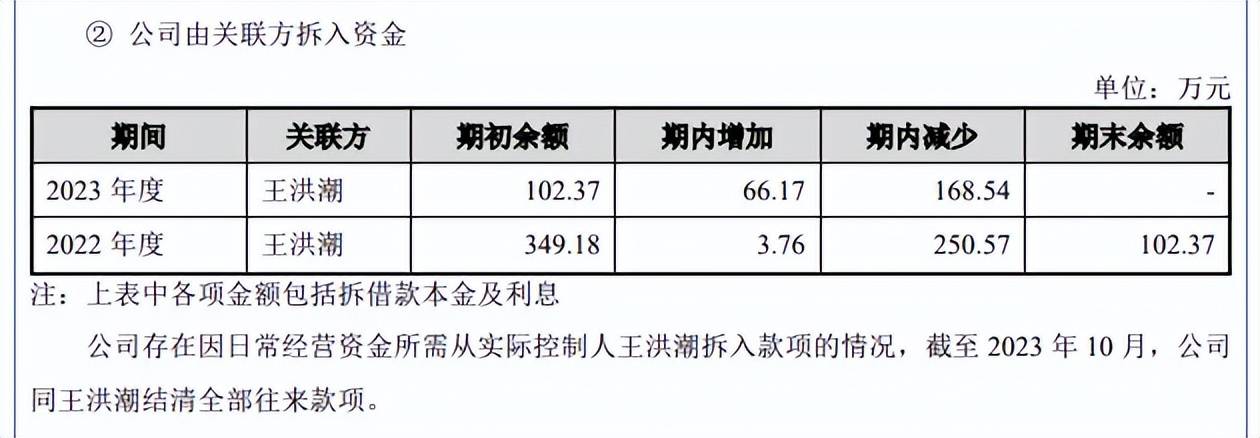 曾拆入近350万元。实际上,恒道科技还向实际控制人王洪潮拆入资金,2022年初、2023年余额分别为349.18万元、102.37万元,主要系经营资金所需而进行拆入。截至2023年10月末,相关拆借已经全部结清。