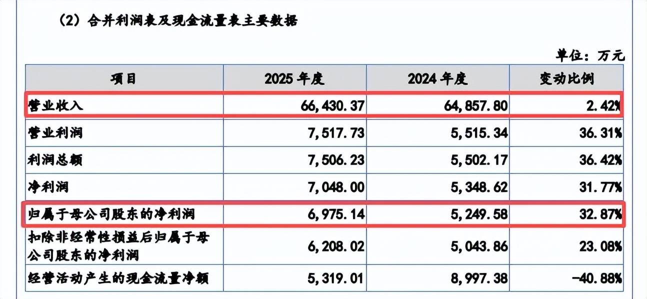 据短平快解读了解,2025年公司实现营业收入、归母净利润分别为6.64亿元、0.7亿元,同比分别增长2.42%、32.87%,其中收入增速较2024年的36.32%大幅放缓。更为重要的是,当期经营现金流为0.53亿元,同比减少0.37亿元,降幅40.88%。