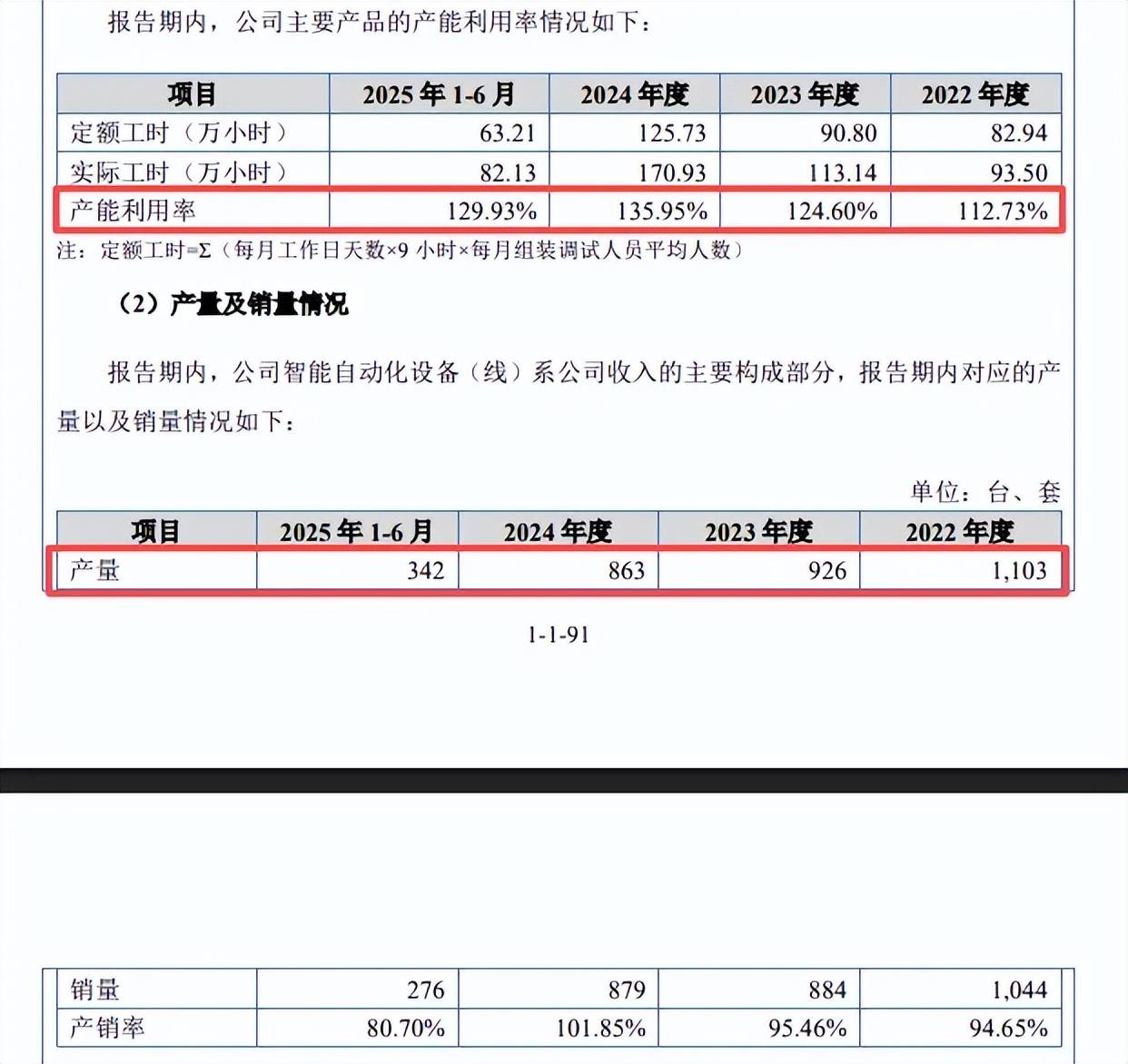 报告期内,公司主要产能利用率分别为112.73%、124.6%、135.95%、129.93%,2024年定额工时为125.73万小时,不过公司智能自动化设备(线)产量呈现下滑态势,分别为1,103套、926套、863套、342套,产销率分别为94.65%、95.46%、101.85%、80.7%。