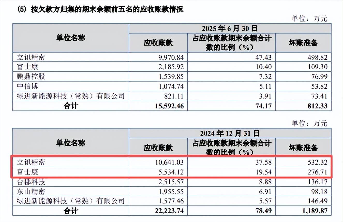 需要指出的是,应收账款保持在高位,分别为2.08亿元、2.24亿元、2.68亿元、1.99亿元,2024年应收账款前五名分别是立讯精密、富士康、台郡科技、东山精密、绿进新能源科技(常熟)有限公司,合计2.22亿元,占比78.49%,前两家企业分别为1.06亿元、0.55亿元,坏账准备分别为532.32万元、276.71万元。作为股东之一的鹏鼎控股2023年、2024年均没有在应收账款前五名之列,期末则跻身前五之列。