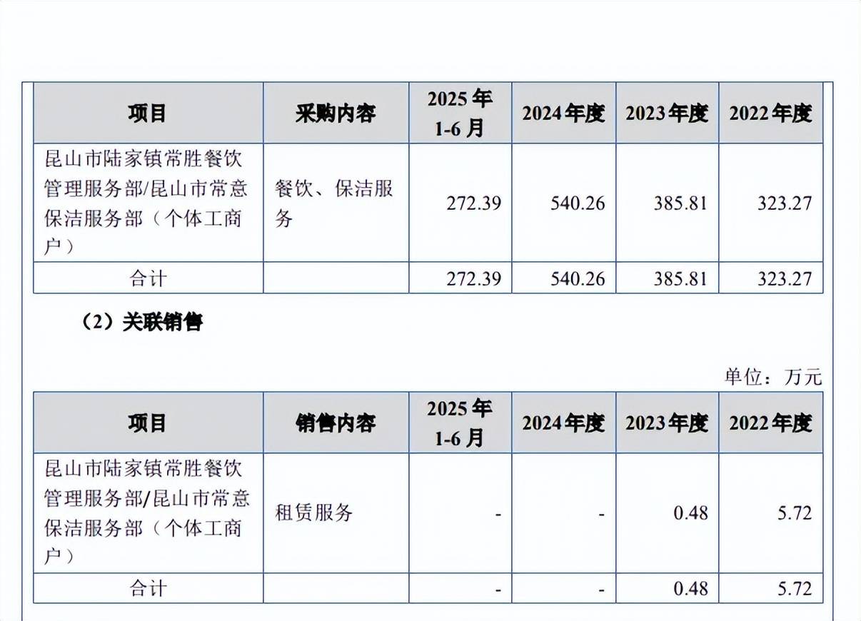 向实控人姐夫采购餐饮、保洁服务。报告期内,鸿仕达向昆山市陆家镇常胜餐饮管理服务部/昆山市常意保洁服务部的采购额分别为323.27万元、385.81万元、540.26万元、272.39万元,采购内容是餐饮、保洁服务。