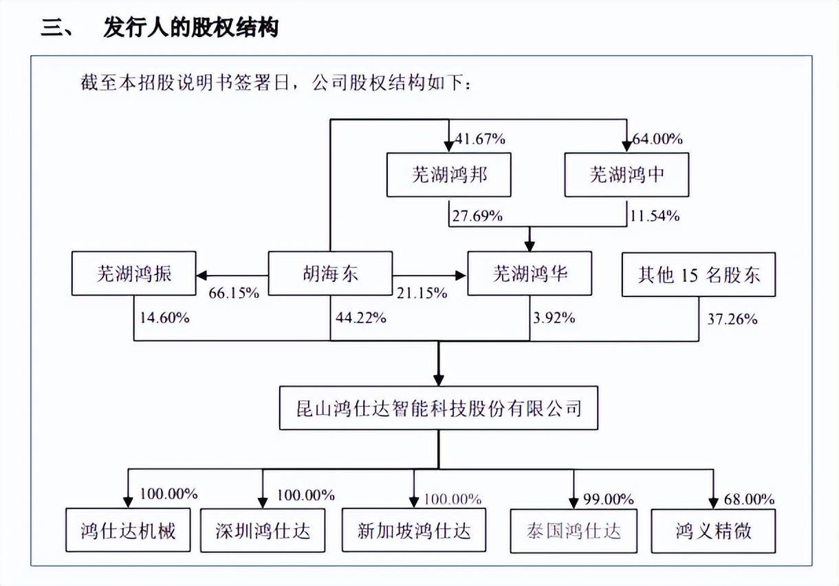胡海东表决权超62%。鸿仕达控股股东、实际控制人均为胡海东,直接持股比例44.22%,通过担任芜湖鸿振、芜湖鸿华合伙份额并担任执行事务合伙人间接控制18.52%的表决权,合计控制公司62.74%的表决权。