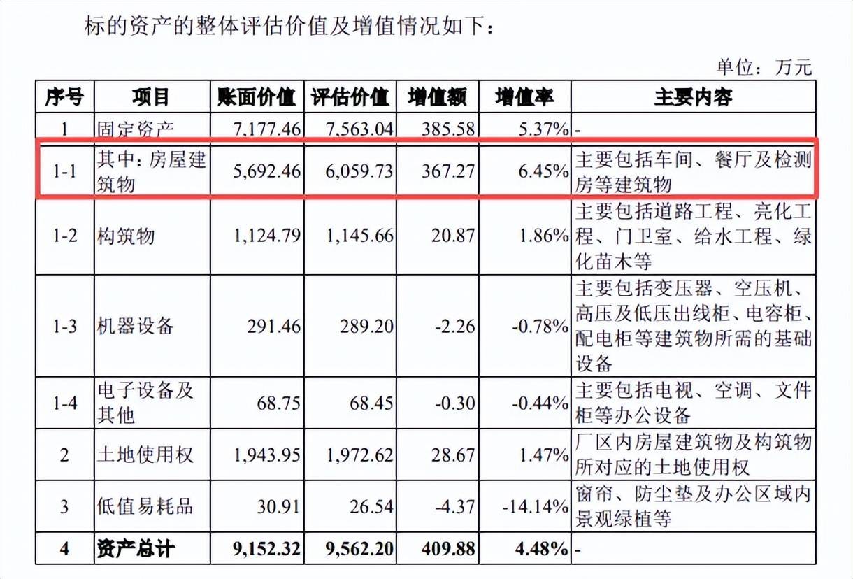 中联资产评估集团河南有限公司出具的评估报告显示,上述资产在评估基准日(2022年3月)的账面价值为9,152.32万元,评估价值为9,562.20万元,评估增值409.88万元,增值率为4.48%。其中房屋建筑物账面价值、评估价值分别为5,692.46万元、6,059.73万元,即增值367.27万元、增值率6.45%。