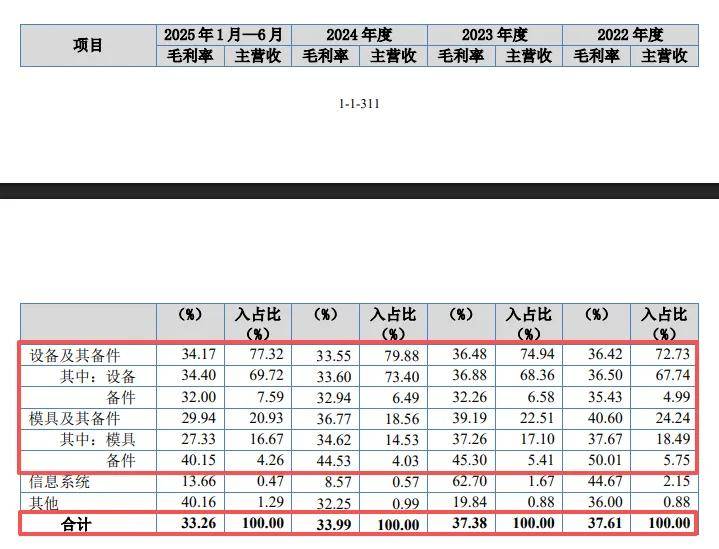 两大核心产品毛利率下滑。海昌智能主营业务收入主要由设备及其备件贡献,报告期实现收入分别为3.75亿元、4.83亿元、6.29亿元、3.34亿元,收入占比从71.99%上升至76.25%;模具及其备件收入紧随其后,分别为1.25亿元、1.45亿元、1.46亿元、0.91亿元,收入占比从23.99%下滑至20.64%。