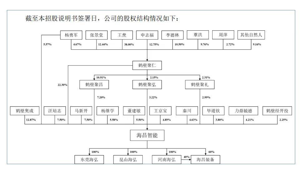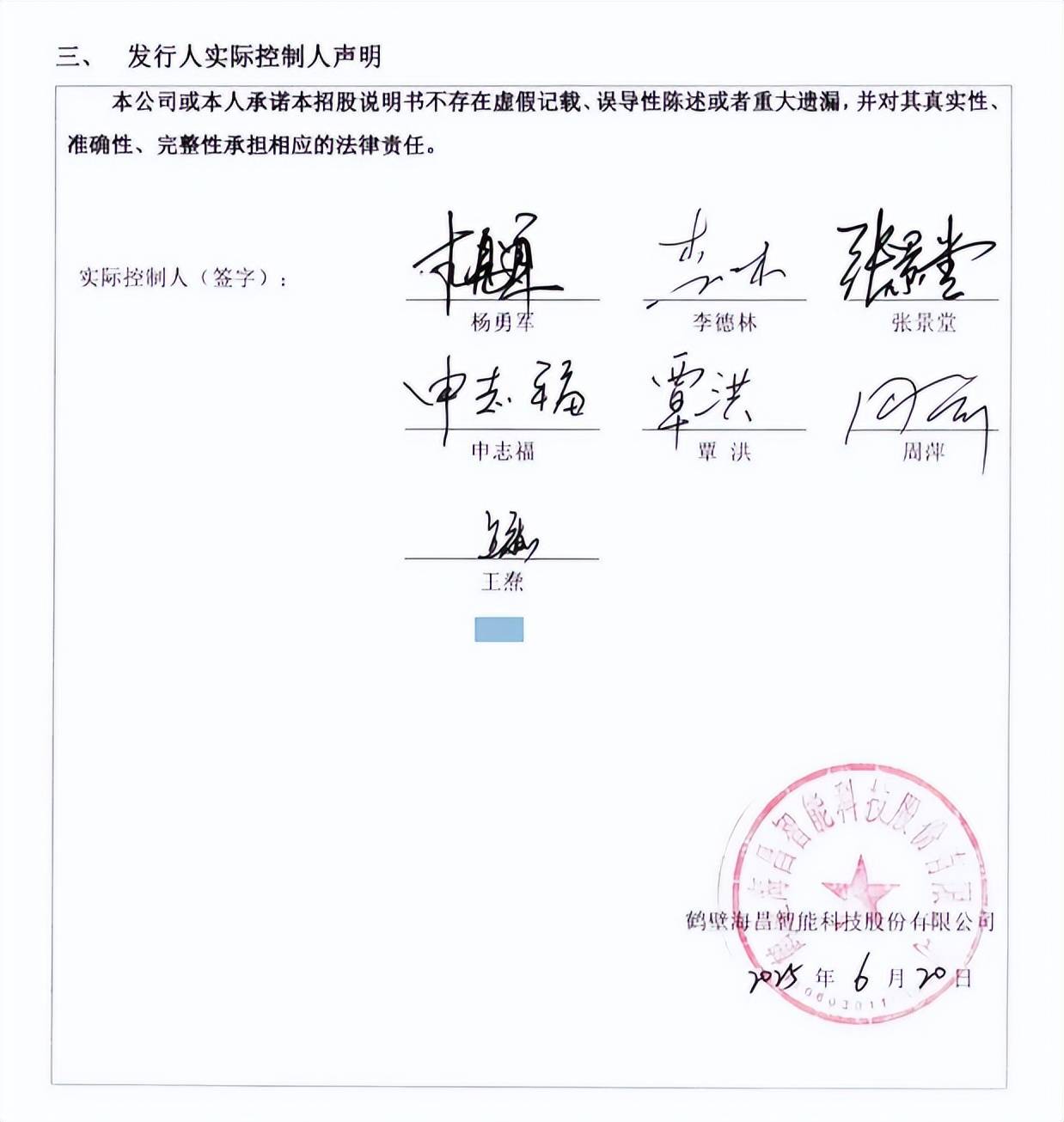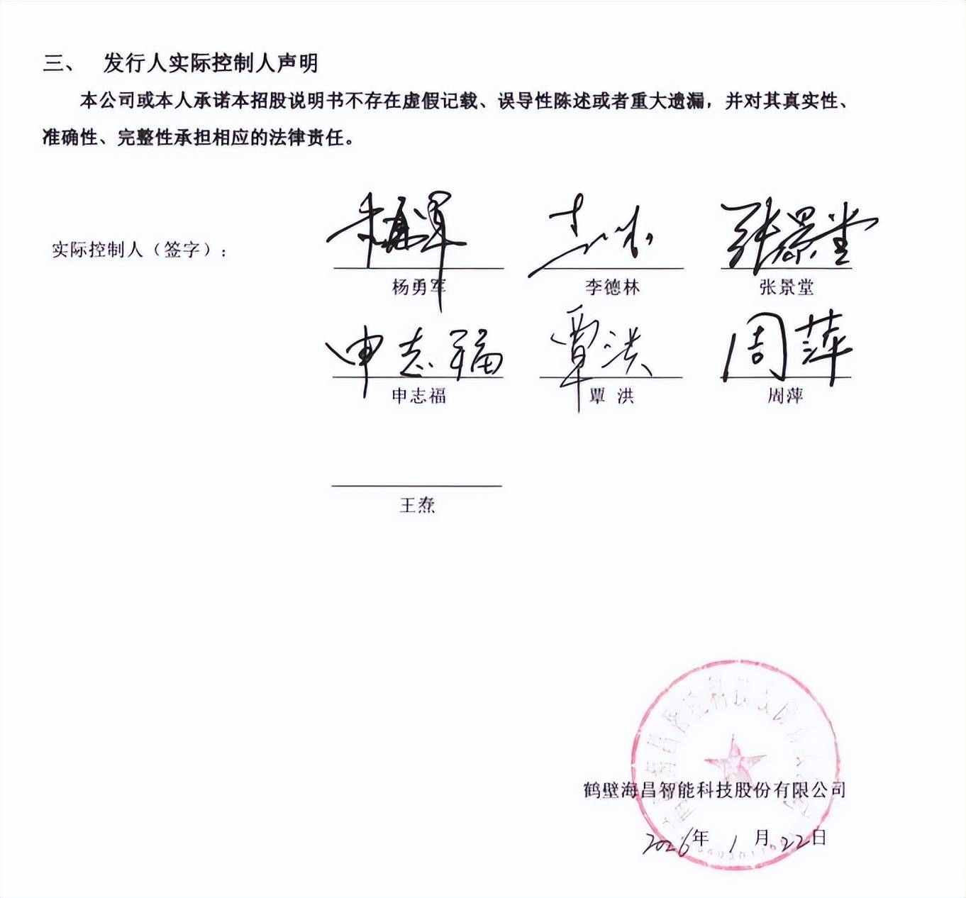 为何王焘没有签名?招股书显示,控股股东鹤壁聚仁共有11名股东,其中王焘持股比例最高,高达38%,间接持有海昌智能8.47%的股权,而董事长杨勇军在鹤壁聚仁的持股比例仅4.67%,间接持股比例1.04%,合计持股比例10.02%,略高于王焘。