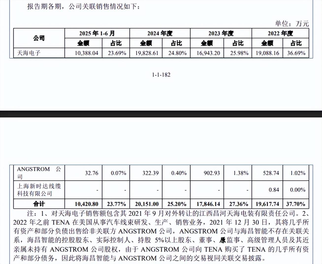 第一大客户天海电子曾是母公司。报告期内,海昌智能对前五大客户销售收入分别为3.32亿元、3.77亿元、3.35亿元、2.43亿元,占比分别为63.78%、57.85%、54.37%、55.41%,客户均是汽车或汽车线束领域的知名企业,包括天海电子、比亚迪、立讯精密、莱尼、捷翼科技。