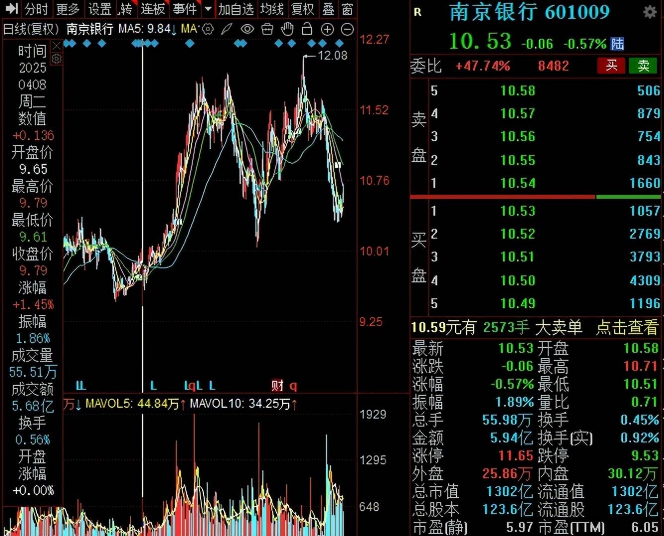 二级市场上,南京银行股价波动较大,2025年4月至今总体呈现“M形”走势,高点至12.08元/股(前复权,下同),此后迎来了较长时间的下跌,截至1月30日早盘收盘,股价为10.53元/股,较高点下跌约13%,总市值1302亿元,TTM市盈率6.05倍。