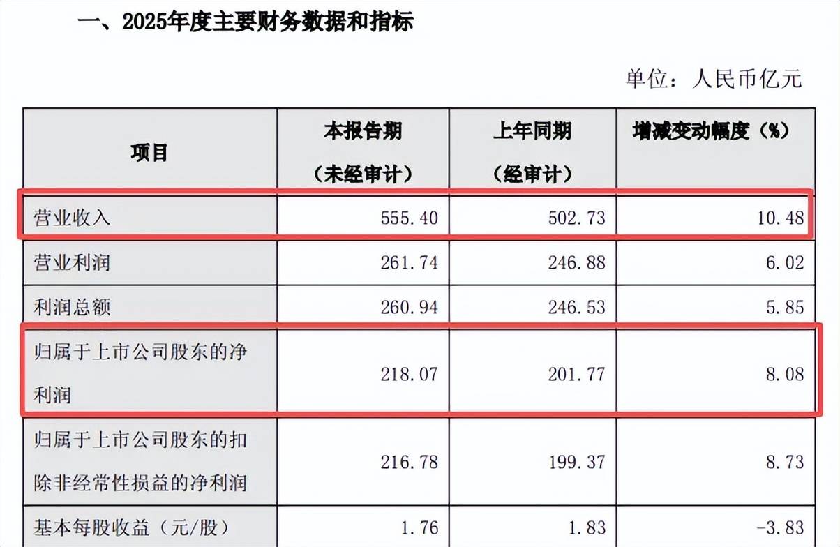 业绩快报显示,公司2025年继续录得营收、净利双增,分别为555.4亿元、218.07亿元,同比分别增长10.48%、8.08%,总体增速略低于2024年,该成绩单还是值得肯定的。
