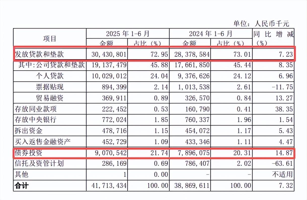 据短平快解读了解,公司同时期利息净收入增速分别为-0.49%、-5.63%、4.62%,去年前三季度同比增长28.52%至252.07亿元,这是总收入维持增长的关键。2025年中报显示,发放贷款和垫款利息收入为304.31亿元,同比增加20.52亿元,增幅7.23%,而债券投资利息收入为90.71亿元,同比增加11.74亿元,增幅14.87%,这是利息净收入大涨的关键。