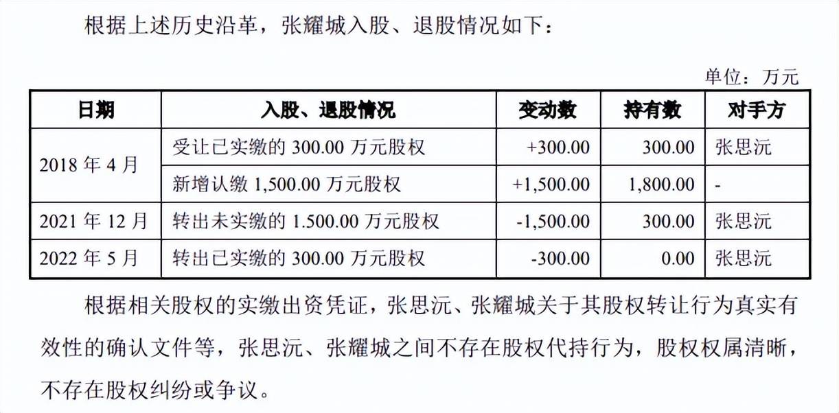 2022年5月,基于家族内部安排,张耀城将其持有的300.00万元股权以300.00万元的价格转让予张思沅,实际未付款,张耀城自此不再直接持股。