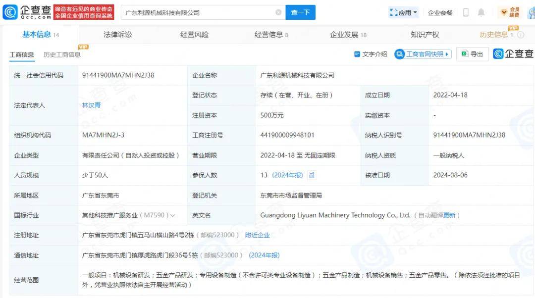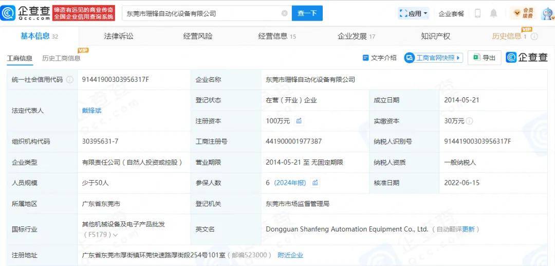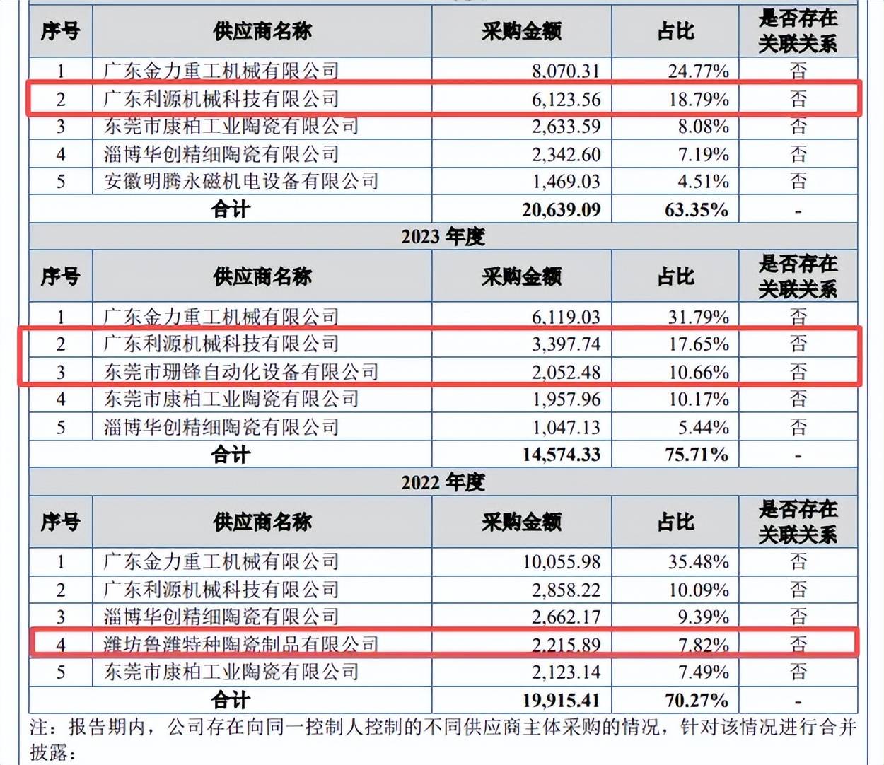 前五供应商存在个位数参保,利源机械成立当年即为第二供应商。报告期内,广东利源机械科技有限公司(利源机械)均为华汇智能第二大供应商,2024年采购额、占比分别为6,123.56万元、18.79%;东莞市珊锋自动化设备有限公司在2023年晋升前五供应商,采购额、占比分别为2,052.48万元、10.66%;潍坊鲁潍特种陶瓷制品有限公司2022年位列前五供应商之类,当年采购额、占比分别为2,215.89万元、7.82%。