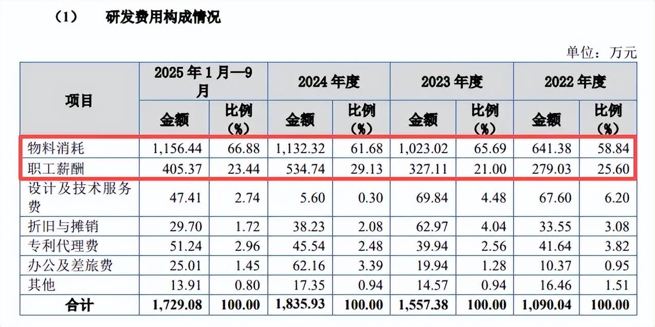 值得一提的是,可比同行先导智能、利元亨、灵鸽科技、宏工科技研发费用重头均为职工薪酬,2024年占研发费用比例分别为80.6%、83.5%、65.69%、64.4%,而物料消耗(原材料)占比分别为9.16%、2.63%、27%、26.14%,那么公司物料消耗占比远超研发费用是否合理?