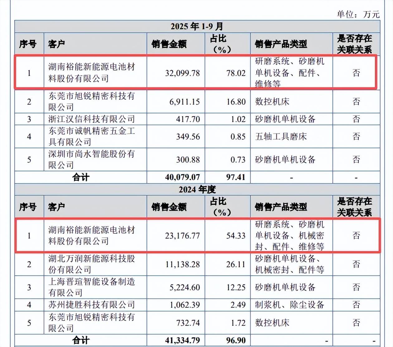 公司另一大客户是万润新能,2023年、2024年均位列前五客户,销售额分别为0.75亿元、1.11亿元,占比分别为24.9%、26.11%。