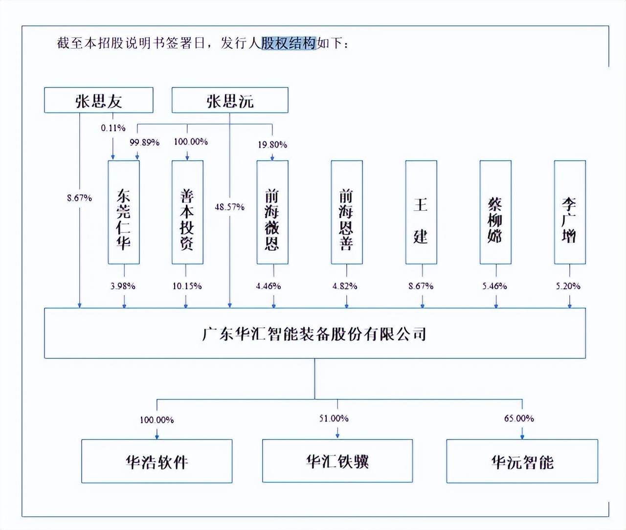 张思沅、张思友兄弟为实控人,表决权近76%。华汇智能控股股东是张思沅,实际控制人是张思沅、张思友兄弟,直接持股分别为48.57%、8.67%,且张思沅通过善本投资、前海薇恩、东莞仁华间接支配18.59%的表决权,兄弟两人合计控制75.84%的表决权。