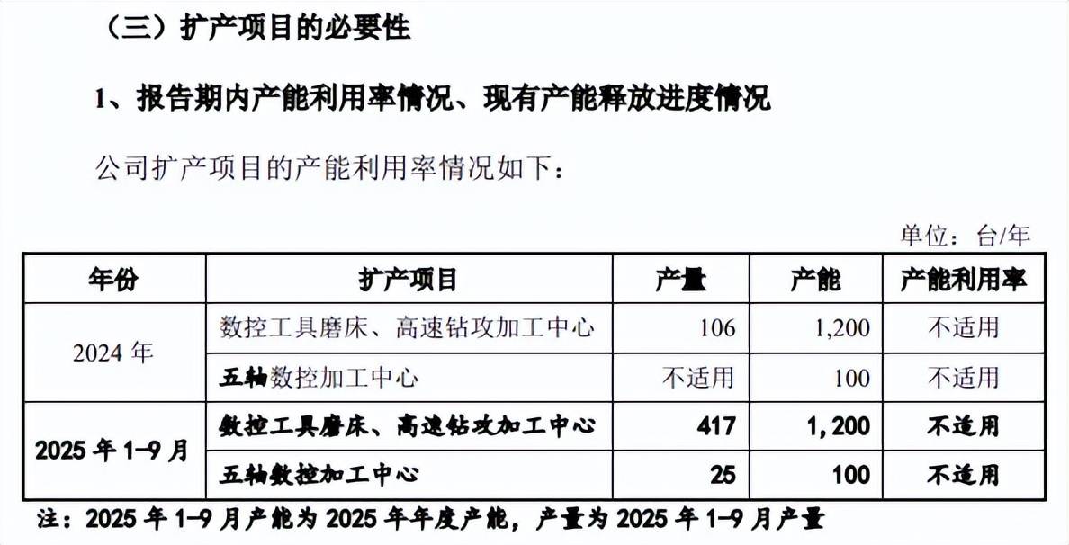 2024年及2025年1-9月,数控工具磨床、高速钻攻加工中心分别为106台、417台,而现有产能为1200台,产能利用率并不高。五轴数控加工中心2024年产量为25台,而现有产能为100台,产能利用率同样不高。