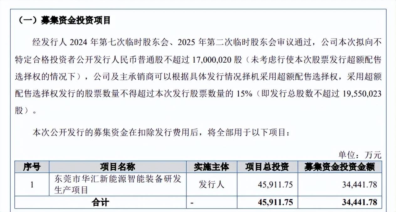 据短平快解读了解,本次IPO,华汇智能拟向不特定合格投资者公开发行不超过17,000,020股,拟募集资金3.44亿元,用于东莞市华汇新能源智能装备研发生产项目,募集资金较此前申报稿减少1.15亿元。