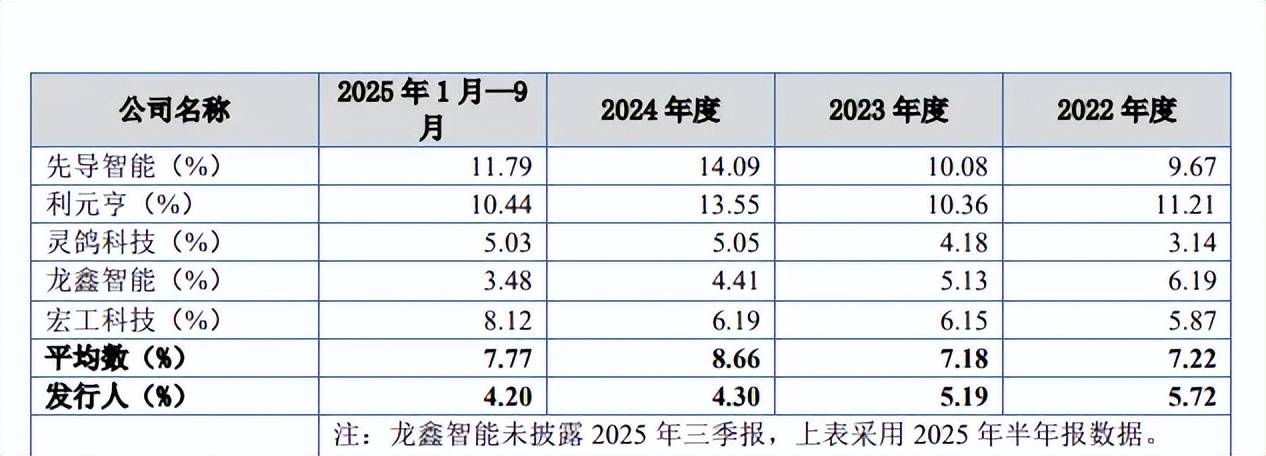 研发费用率下滑,落后于行业均值。2022年至2025年1-9月(报告期),华汇智能研发费用稳增,分别为1,090.04万元、1,557.38万元、1,835.93万元、1,729.08万元,研发费用率呈现下滑态势,分别为5.72%、5.19%、4.3%、4.2%。
