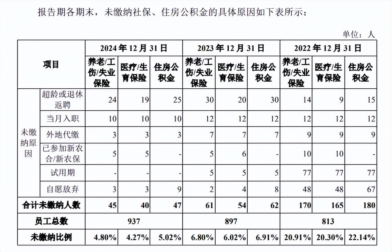 2022年未缴纳社保、公积金人数较多。2022年至2024年,春光集团养老/工伤/失业保险未缴纳人数分别为170人、61人、45人,占比分别为20.91%、6.8%、4.8%;住房公积金未缴纳人数分别为180人、62人、47人,占比分别为22.14%、6.91%、5.02%。
