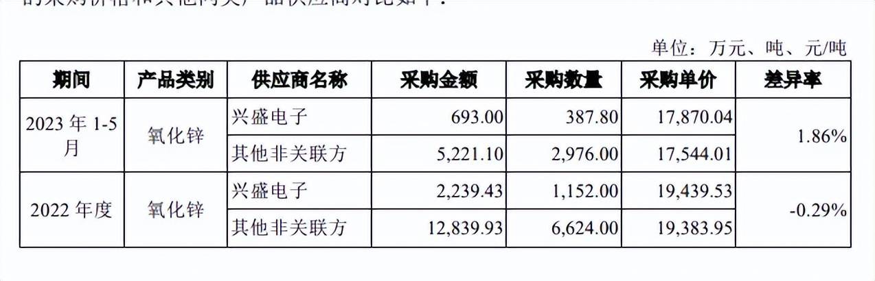 从采购价格来看,2022年、2023年1-5月,公司向兴盛电子采购氧化锌的每吨单价分别为19,439.5元、17,870.04元,均高于向非关联方采购的单价,后者分别为19,383.95元、17,544.01元,差值分别为55.58元、326.03元,后者价格差异为何突然大涨?另外,兴盛电子该时期向公司销售氧化锌占其同类业务的比例为100%,即主要为公司服务,那么公司理应有更多议价权才对,为何对兴盛电子采购单价高于非关联方?