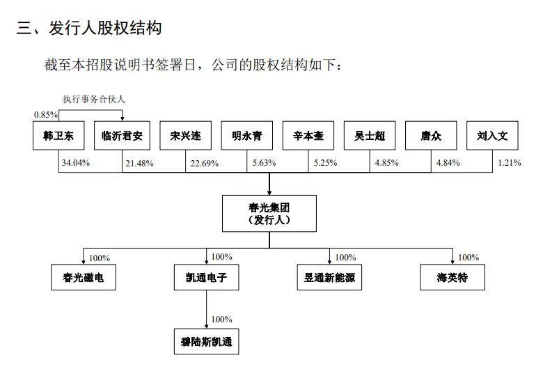 韩卫东表决权超55%。春光集团控股股东、实际控制人均为韩卫东,直接持股比例为34.04%,且通过临沂君安间接控制21.48%的表决权,合计控制55.52%的表决权。