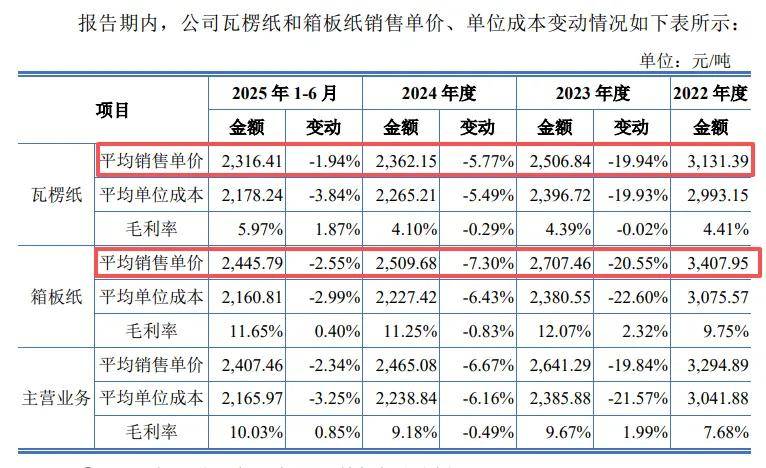 2022年至2025年1-6月(报告期),箱板纸平均销售单价从3,407.95元/吨下滑至期末2,445.79元/吨,累加下滑28.23%;瓦楞纸平均销售单价从从3,131.39元/吨下滑至2,316.41元/吨,累计下滑26.03%。