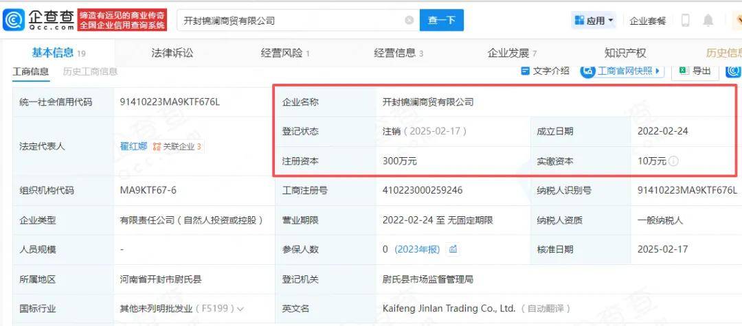 开封锦澜商贸有限公司成立于2022年2月,注册资本300万元,实缴资本10万元,翟红娜、王大战分别持股70%、30%,参保人数均为0人,2025年2月17日注销。