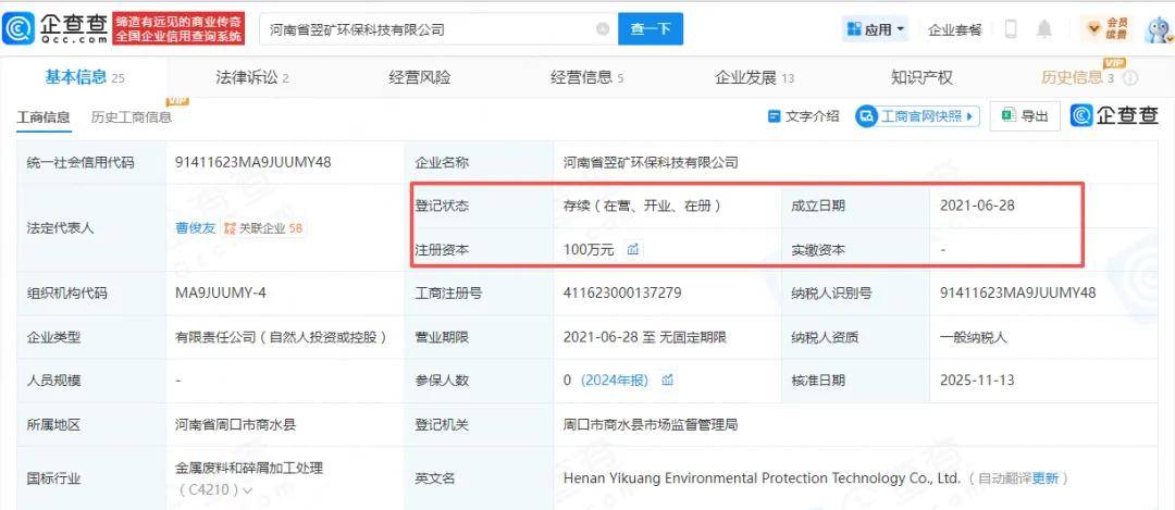企查查显示,翌矿环保成立于2021年6月,注册资本为100万元(2025年11月之前为1000万元)实缴资本为0元,曹俊友、吴明伟分别持股60%、40%,参保人数均为0人。