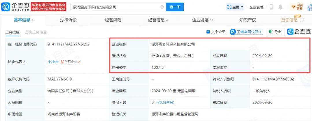 震奇环保成立于2024年9月,注册资本为100万元,实缴资本为0元,由王桂华全资持股,参保人数为0人。漯河震隆环保科技有限公司成立于2023年8月,注册资本为100万元,实缴资本为0元,王桂华、肖殿礼分别持股50%、50%,参保人数为0人,2025年3月31日注销。