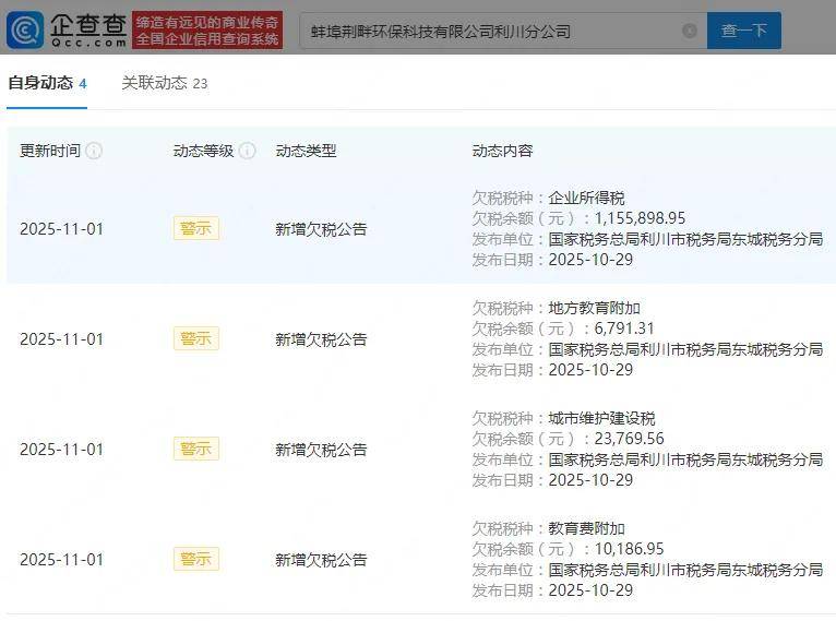 企查查显示,蚌埠荆畔环保分公司成立时间为2022年6月,社保缴纳人数均为0人,2025年11月,该公司新增年欠税公告,其中企业所得税欠税余额为1,155,898.95元。