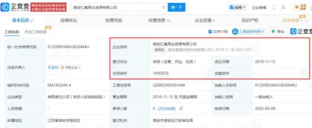 淮安汇嘉再生资源有限公司成立于2018年11月,注册资本为1000万元,实缴资本为0元,王金松、刘永红分别持股99%、1%,参保人数均为0人。