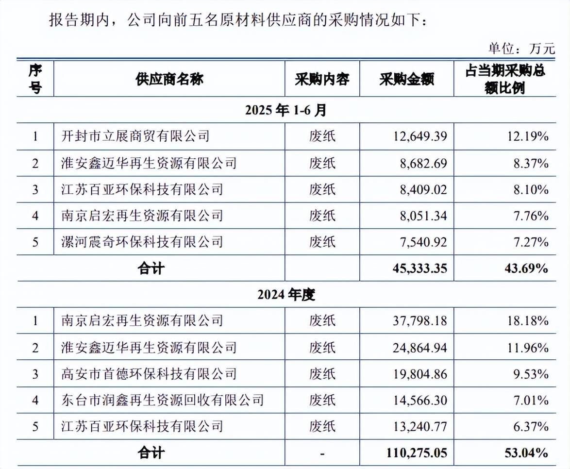 进一步来看,公司向前五大供应商的采购内容多为废纸,2022年、2023年向前四名供应商采购内容均为废纸,采购金额合计99353.54万元、116286.6万元,2024年、2025年1-6月前五大供应商均为废纸企业,采购额分别为110,275.05万元、45,333.35万元,占比分别为53.04%、43.69%。