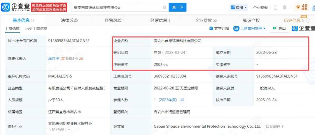 首德环保成立于2022年6月,注册资本为200万元,实缴资本为0元,涂立军、付艳杰分别持股60%、40%,2022年、2023年参保人数分别为5人、1人,2025年3月24日注销。