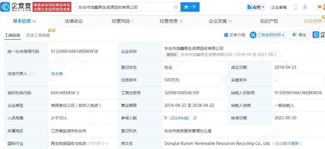 宜春国再再生资源限公司成立于2023年12月,注册资本为500万元,实缴资本为0元,邢大伟、李红菊分别持股70%、30%,2023年参保人数为0人,2024年参保人数为2人。