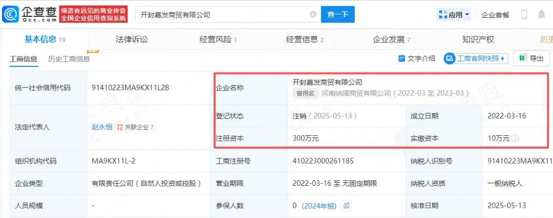 开封嘉发商贸有限公司成立于2022年3月,注册资本为300万元,实缴资本为10万元,赵永恒、白艳芳分别持股80%、20%,参保人数均为0人,2025年5月13日注销。