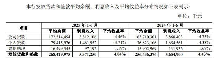 贷款利息收入连降。自2022年起,青农商行来自发放贷款和垫款的利息收入连降,当年为119.02亿元,此后两年分别为114.47亿元、111.87亿元,2025年1-6月为53.71亿元,同比减少2.84亿元,降幅5.02%,平均收益率从初期的5.04%下滑至末期的4.04%,累计下滑1个百分点。