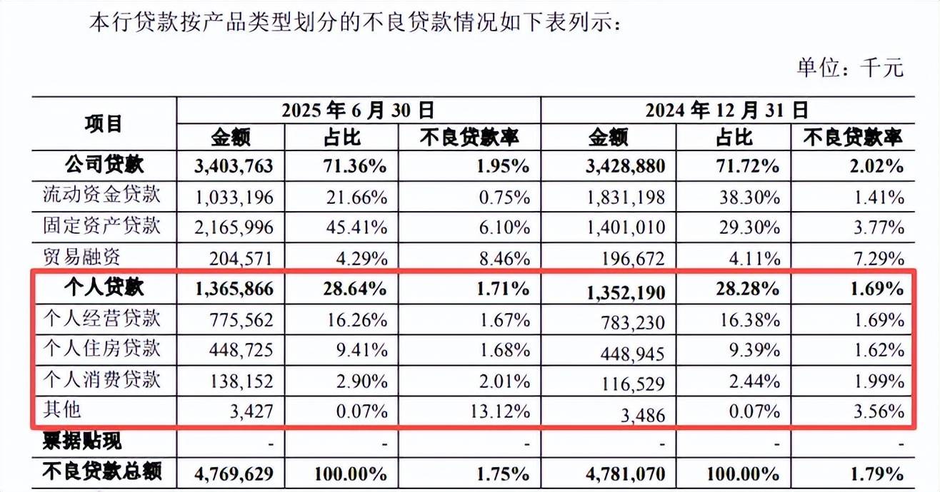 个人消费不良贷款增加。2025中报显示,青农商行个人不良贷款、不良贷款率分别为13.66亿元、1.71%,较上年末分别增加0.14亿元、上升0.02个百分点。