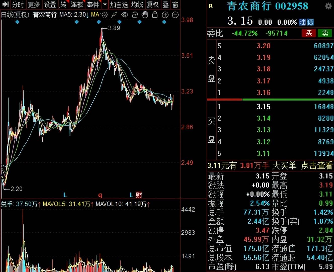 二级市场上,青农商行股价从2024年9月的2.2元/股(前复权,下同)的低点上升至3.89元/股的高点,随后总体呈现下滑态势,截至2月6日收盘,股价为3.15元/股,较高点下滑约19%,总市值175亿元,TTM市盈率5.89倍。
