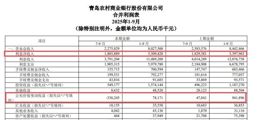 2025年前三季度,青农商行收入没能维持增长态势,出现下滑,主要受公允价值变动收益大幅减少影响,利润增长则与信用减值损失减少有关,而从贷款质量来看,期末不良贷款率高居A股农商行之首,有待进一步改善。