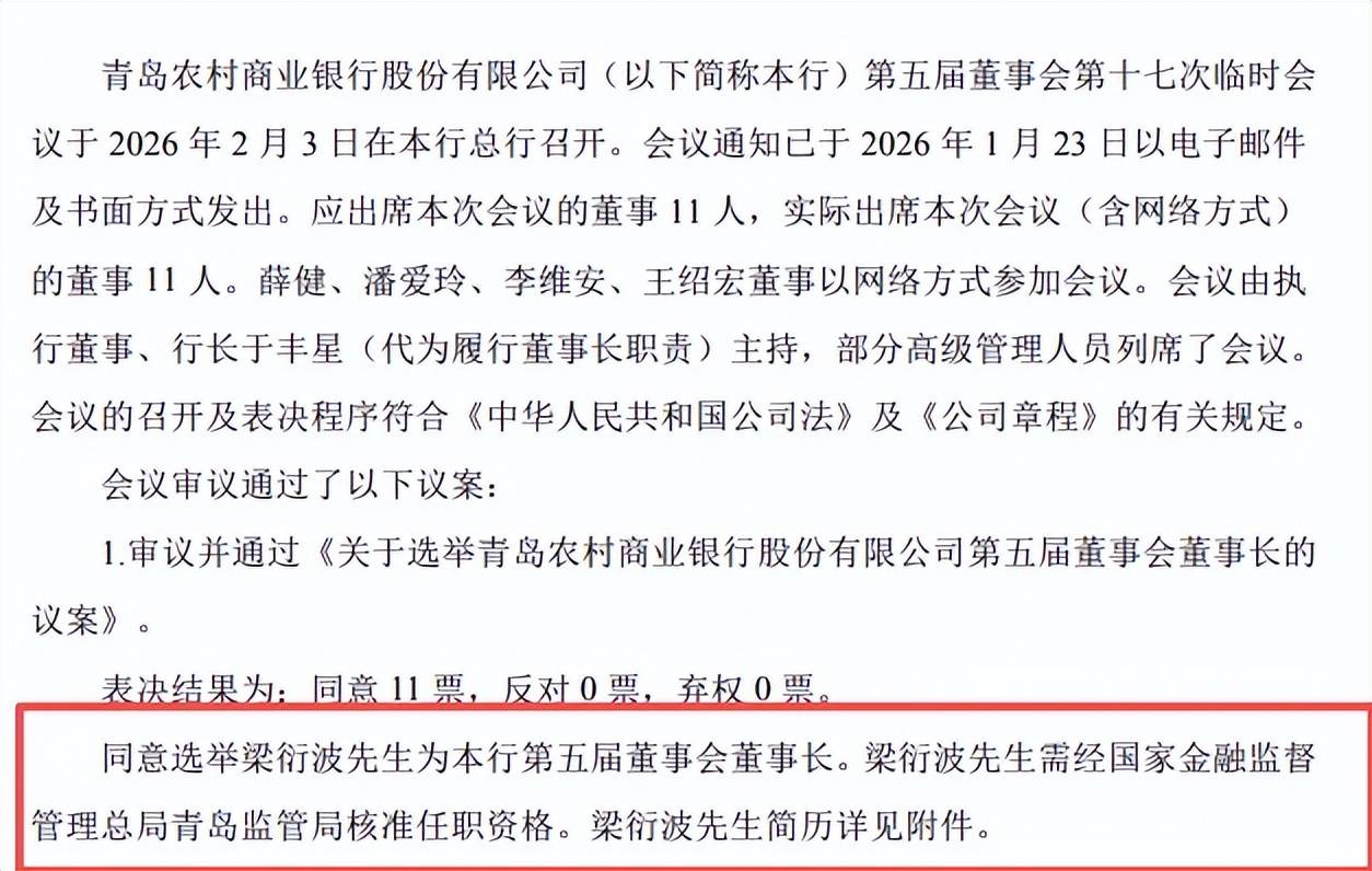 选举新董事长。2月3日,青农商行迎来重大人事调整,股东会通过选举梁衍波为第五届董事会执行董事的议案。同日,董事会同意选举梁衍波为第五届董事会董事长,任职资格尚需国家金融监督管理总局青岛监管局核准。