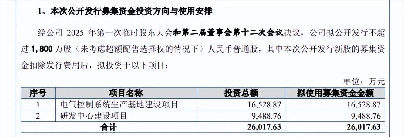 据短平快解读了解,本次IPO,嘉晨智能拟公开发行不超过1,800万股,拟募集资金2.6亿元,用于电气控制系统生产基地建设项目(生产基地)、研发中心建设项目,拟投入募集资金分别为1.65亿元、0.95亿元。