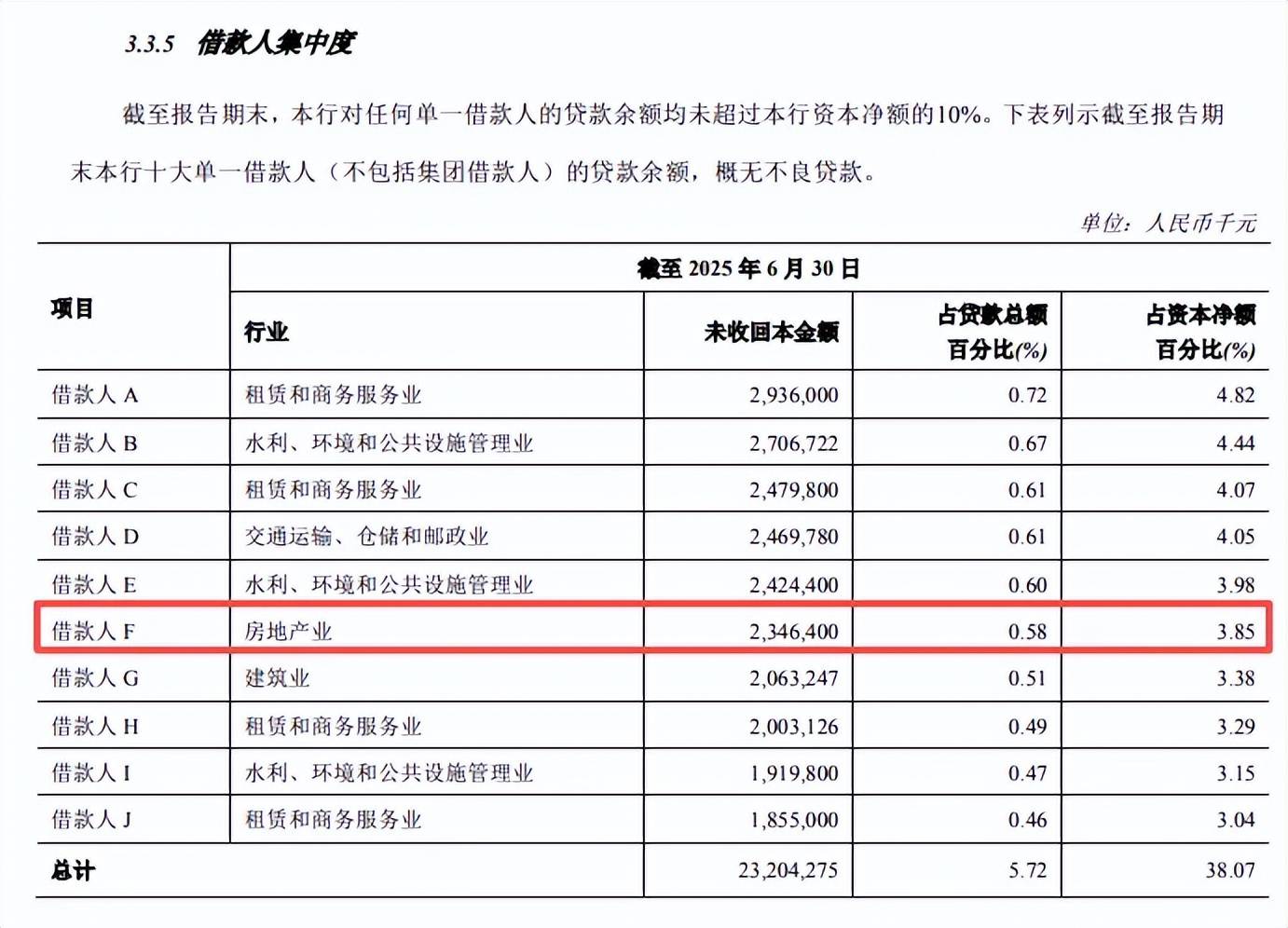 贷款集中度高,11亿元诉讼胜诉。2025中报显示,郑州银行对前十客户贷款合计232.04亿元,占比资本净额高达38.07%,其中4个客户是租赁和商务服务业、3个客户是水利、环境和公共设施管理业、房地产业、建筑业、交通运输、仓储和邮政业均为1个客户,其中对房地产业客户,即借款人F的贷款为23.46亿元。
