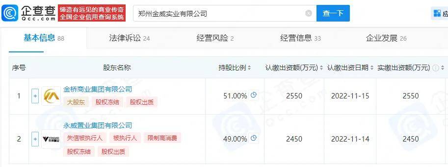 企查查显示,2023年5月至今,金威实业存在6笔股权冻结,被执行人均为永威置业集团有限公司,其是金威实业持股49%的股东,目前存在失信被执行人、被执行人、限制高消费、股权冻结、股权出质等标签,持股51%的股东金桥商业集团有限公司存在股权冻结、股权出质,后续金威实业能否偿付尚有待时间验证,不过郑州银行已对该笔贷款计提了相应贷款损失准备,不会对本期或期后利润产生不利影响。