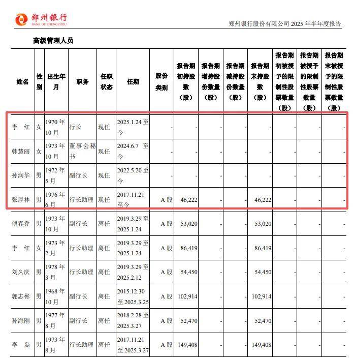 事实上,李红正式履职行长后,公司迎来了较大人事调整,2025年1月24日,副行长傅春乔、行长助理李红(与行长同名同姓)因工作原因辞职;2月12日,行长助理刘久庆因个人原因辞职;3月25日,副行长郭志彬因身体原因辞职;3月27日,副行长孙海刚、行长助理李磊因工作调整辞职。