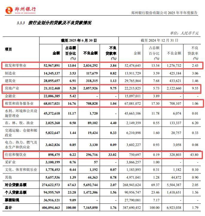 对公、零售不良贷款双增。上文提到郑州银行信用减值损失主要集中公司银行业务,这是因为对公不良贷款要高于零售不良贷款,2025年中报分别为56.93亿元、14.72亿元,较上年末分别增加1.88亿元、5365.5万元;不良贷款率分别为2.07%、1.56%,前者较上年末分别上升0.02个百分点、后者则持平。