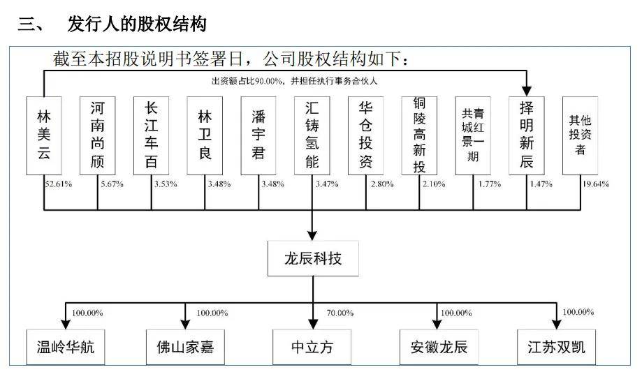 实控人表决权近58%,中专学历。龙辰科技控股股东、实际控制人均为林美云,直接持股比例为52.16%,且通过担任择明新辰的执行事务合伙人控制1.47%的表决权,合计控制公司54.08%股权。另外,2026年2月12日,林美云与其胞弟林卫良达成一致行动协议,后者持股比例3.48%,即林美云等合计控制公司57.56%的股份。