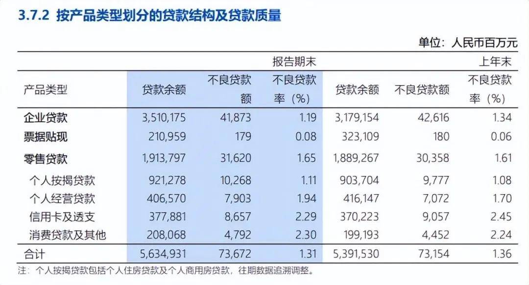 零售贷款中,个人按揭贷款、个人经营贷款、消费贷款及其他的不良贷款分别102.68亿元、79.03亿元、47.92亿元,较年初均有所上升,对应的不良贷款率分别为1.11%、1.94%、2.3%,同样较年初有所上升,而信用卡及透支的不良贷款86.57亿元,不良贷款率2.29%,较年初均有所下滑。