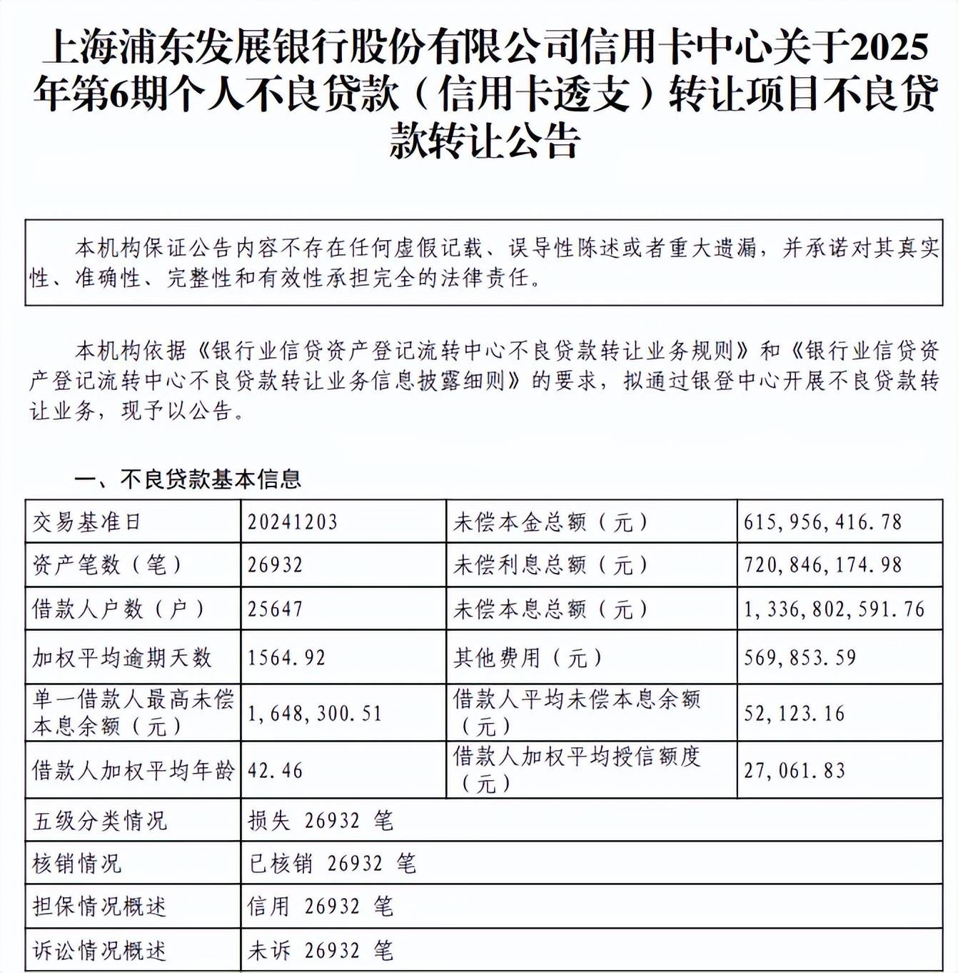 事实上,信用卡不良贷款的处置才是浦发银行的重点,2025年6月,公司一次性披露第6期至第9期信用卡透支不良贷款,未偿本息总额分别为13.37亿元、11.71亿元、12.43亿元、5.42亿元,合计约42.93亿元。