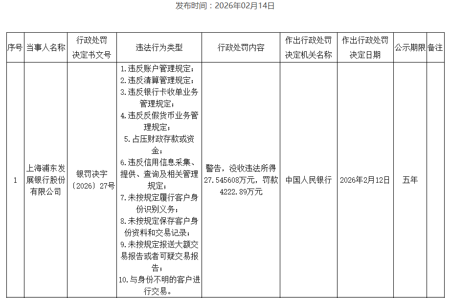 2月12日,浦发银行领巨额罚单,因存在违反账户管理规定;违反清算管理规定;违反银行卡收单业务管理规定;违反反假货币业务管理规定;占压财政存款或资金;违反信用信息采集、提供、查询及相关管理规定;未按规定履行客户身份识别义务;未按规定保存客户身份资料和交易记录;未按规定报送大额交易报告或者可疑交易报告;与身份不明的客户进行交易等违法事实,被中国人民银行警告,没收违法所得27.545608万元,罚款4222.89万元,公示期限为5年。