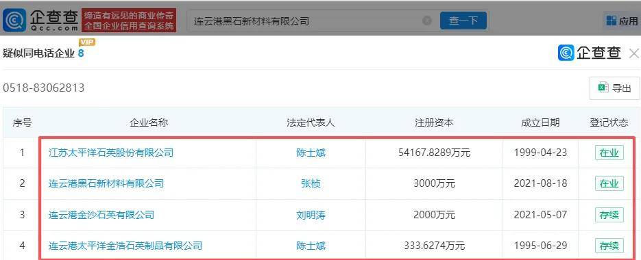 需要指出的是,连云港黑石的联系电话(0518-83062813)与石英股份、连云港金沙石英有限公司(连云港金沙)、连云港太平洋金浩石英制品有限公司(石英股份子公司)相同,为何3家企业共同使用同一个联系号码?