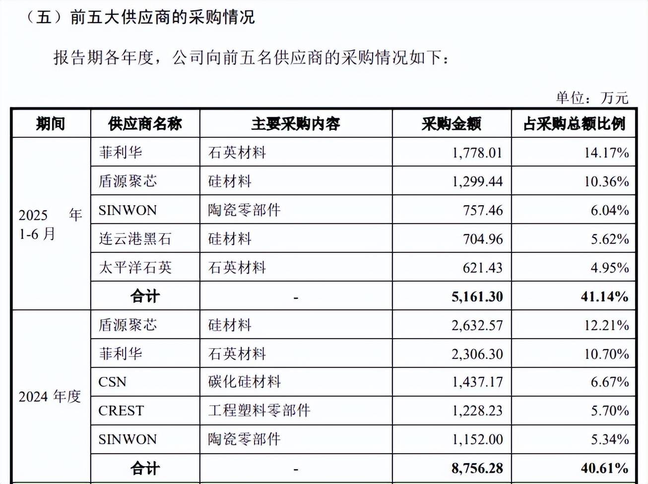 两大供应商为何共用同一联系方式?报告期内,臻宝科技前五大供应商变动较大,2025年1-6月新增连云港黑石新材料有限公司(连云港黑石)、太平洋石英两大供应商,采购额分别为704.96万元、621.43万元,采购内容分别为硅材料、石英材料。